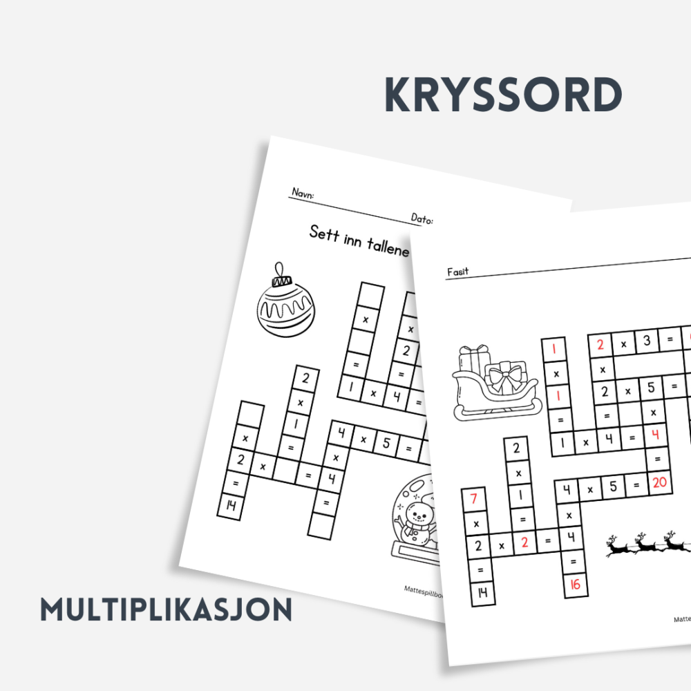 Dette arbeidsarket er et gangekryssord for barn som øver på gangetabellen i førjulstiden. Oppgaven går ut på å fylle inn de manglende tallene slik at alle multiplikasjonsstykkene stemmer. Arbeidsarket er utformet som et kryssord, hvor elevene må bruke logisk tenkning og kunnskap om multiplikasjon for å løse oppgavene. Passer til klasserommet, hjemmeoppgave eller som ekstraoppgave for å styrke regneferdighetene.
